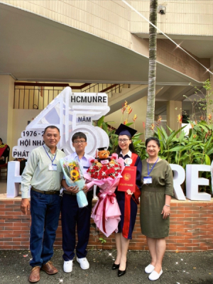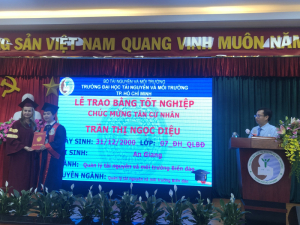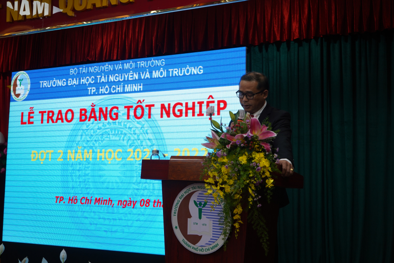 Tại buổi Lễ, PGS.TS. Huỳnh Quyền- Hiệu trưởng Nhà trường thay mặt Hội đồng trường, Ban Giám hiệu gửi đến các Tân Thạc sĩ, Tân Cử nhân, Tân Kỹ sư cùng gia đình lời chào mừng và lời chúc mừng nồng nhiệt nhất.Thầy Hiệu trưởng cũng chía sẻ niềm vui, cảm xúc của các anh chị Tân Thạc sĩ, của các em Tân Cử nhân, Tân Kỹ sư và mong rằng đó sẽ mãi là những kỷ niệm đẹp của một thời sinh viên dưới mài trường HCMUNRE thân thương. Thầy Hiệu trưởng chúc các bạn luôn có sự thành công trong cuộc sống, trong công việc và luôn vui mừng được đón tiếp các bạn trở lại Trường học tập, nghiên cứu ở bậc học cao hơn.