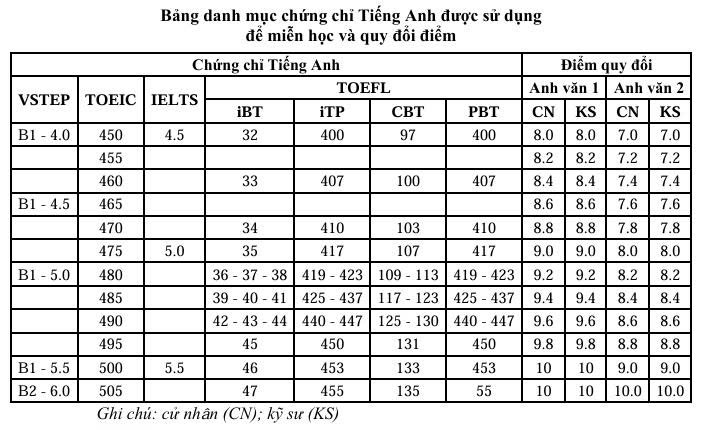 + Sinh viên cần tham khảo Bảng danh mục chứng chỉ Tiếng Anh được sử dụng để miễn học và quy đổi điểm để xác định học phần muốn được miễn và quy đổi điểm. Có thể đề nghị miễn cả 2 học phần hoặc chỉ miễn Anh văn 1 và đăng ký học Anh văn 2 nếu không hài lòng với điểm quy đổi (ghi rõ nguyện vọng trong Đơn đăng ký xét miễn học và công nhận điểm quy đổi học phần Anh văn).